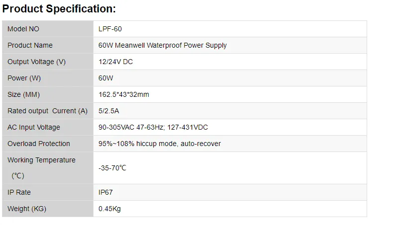 Sie sind hier: Heim » Produkte » LED -Stromversorgung » Meanwell Netzteil » 60W MEGERWELL NETZUNG FÜR LED -STRIPS (wasserdicht)