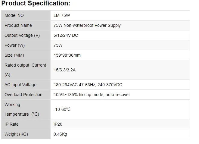 75W Stromversorgung für LED-Streifen (Nicht-Wassersicher)