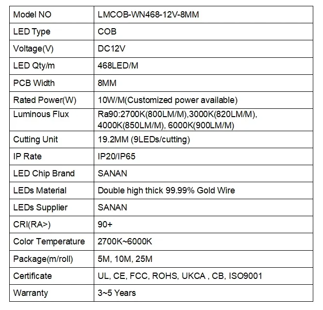 COB 468LEDS/M 12 V 8mm cri ≥ 90